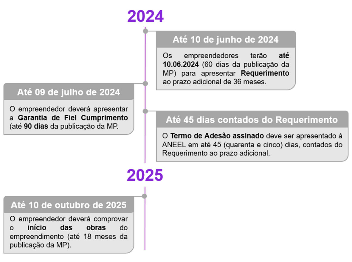 Além dos prazos para apresentar a solicitação à ANEEL e para protocolar o Termo de Adesão assinado, o empreendedor interessado deverá também, como condição para usufruir do direito ao prazo adicional: