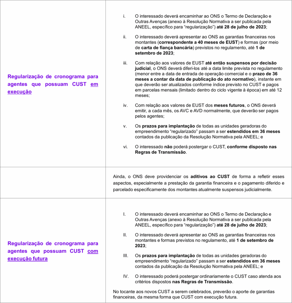Apesar da aprovação do mecanismo pela ANEEL, a expectativa do setor era que eventual regularização de cronograma viesse acompanhada ao menos da postergação do pagamento do EUST. Contudo, da forma como aprovado o mecanismo pela ANEEL, os agentes com CUST em execução (caso dos projetos judicializados) precisarão pagar o encargo de uso do sistema de transmissão a partir da data em que o contrato entraria em execução originalmente, ainda que parcela pequena (suspensa atualmente por liminares) seja diferida.