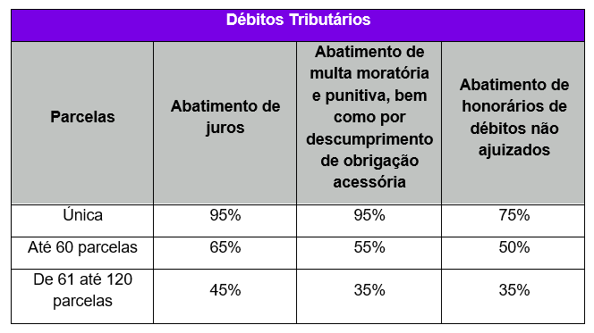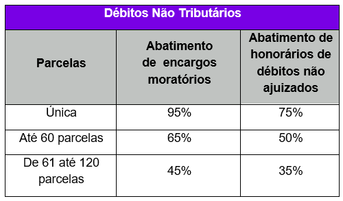 O Programa prevê abatimentos, além da possibilidade de parcelamento, conforme descrito no quadro a seguir.