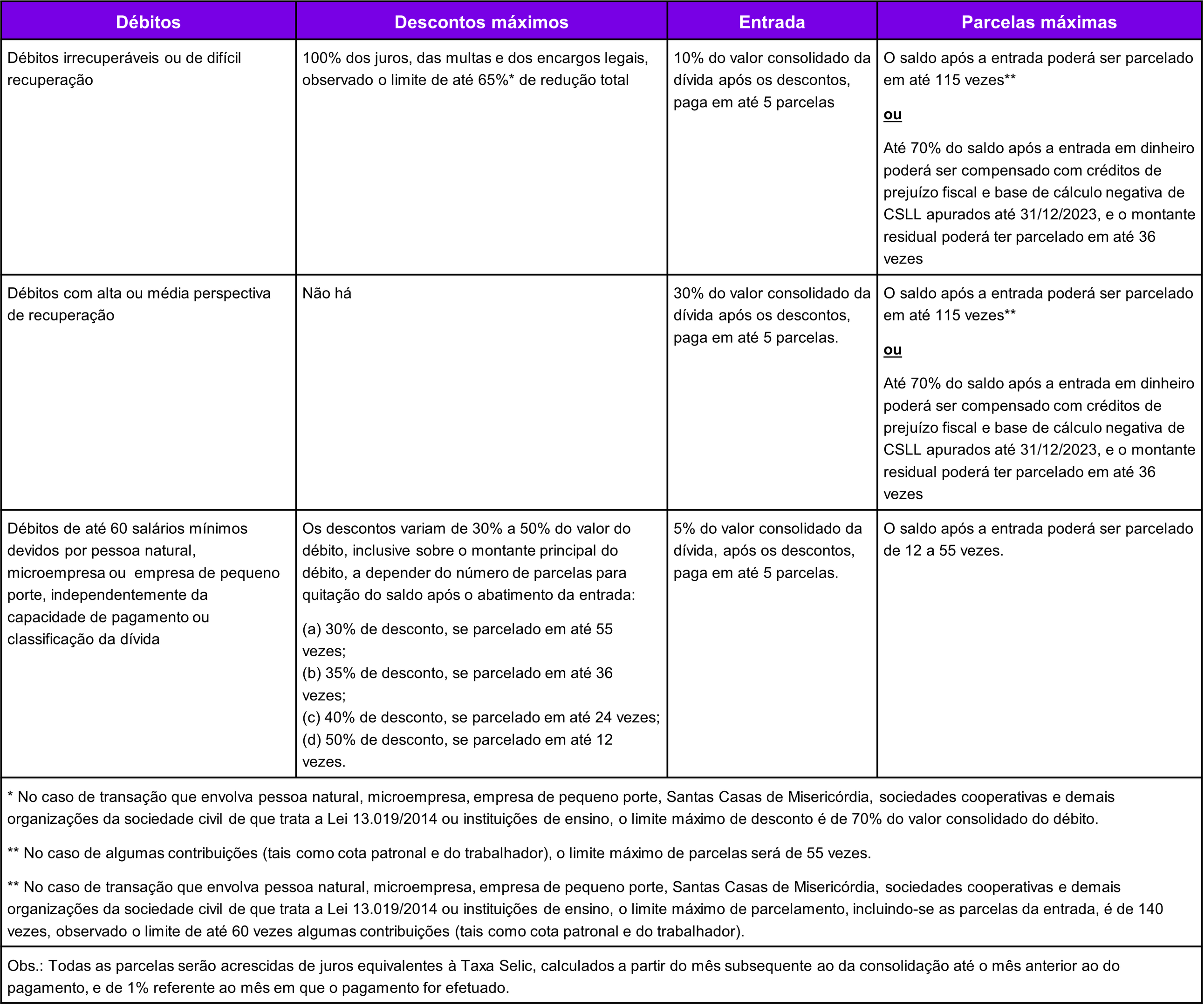 Quem aderir poderá obter descontos (especialmente em caso de débitos considerados irrecuperáveis ou de difícil recuperação), além da possibilidade de parcelamento e pagamento com créditos de prejuízo fiscal e base negativa de CSLL, conforme detalhado a seguir:
