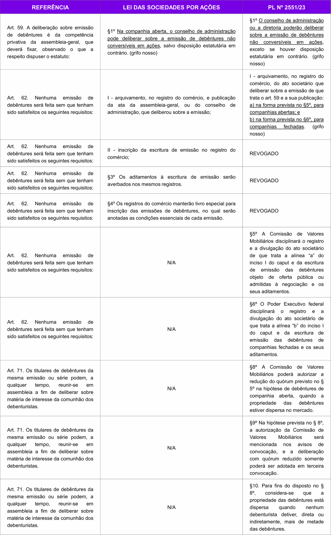 A tabela ilustra as alterações à Lei das Sociedades por Ações trazidas pelo PL nº 2551/23 mencionadas acima: