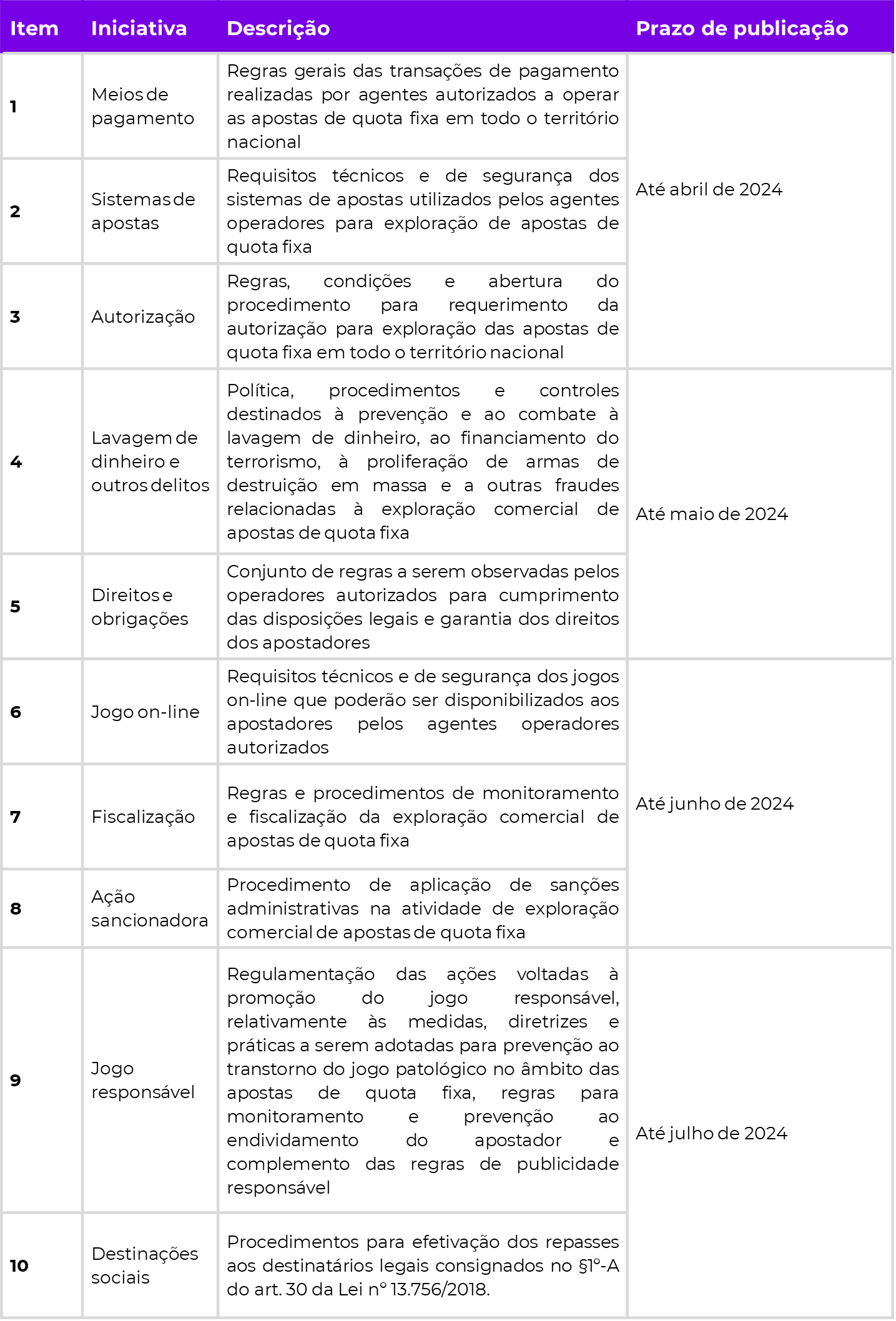 A Agenda Regulatória da SPA foi dividida em quatro fases, por ordem de priorização das iniciativas, de modo que as respectivas portarias deverão ser publicadas de acordo com as datas indicadas abaixo:
